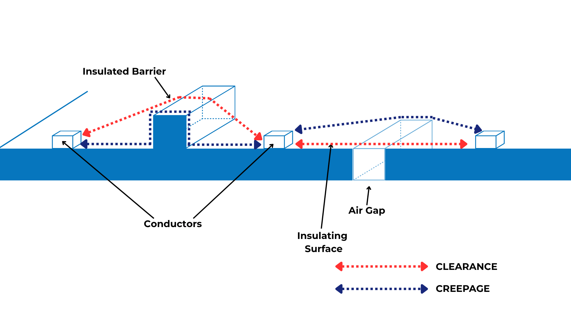 - Creepage is the shortest path along the surface of an insulating material.