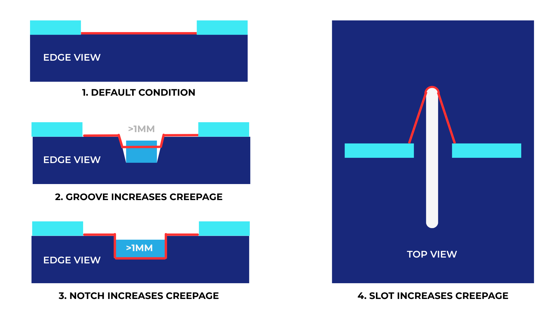 - Consider slots, notches or barriers to increase creepage on compact boards.