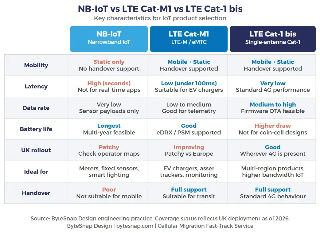 | Which countries will this device operate in? | NB-IoT and Cat-M1 rollout is patchy in the UK and varies significantly by country. Cat-1 bis operates wherever 4G is present. Multi-region deployments often need a multi-standard modem or a fallback strategy. |